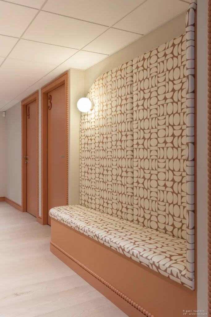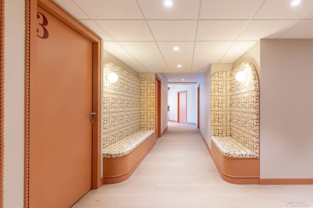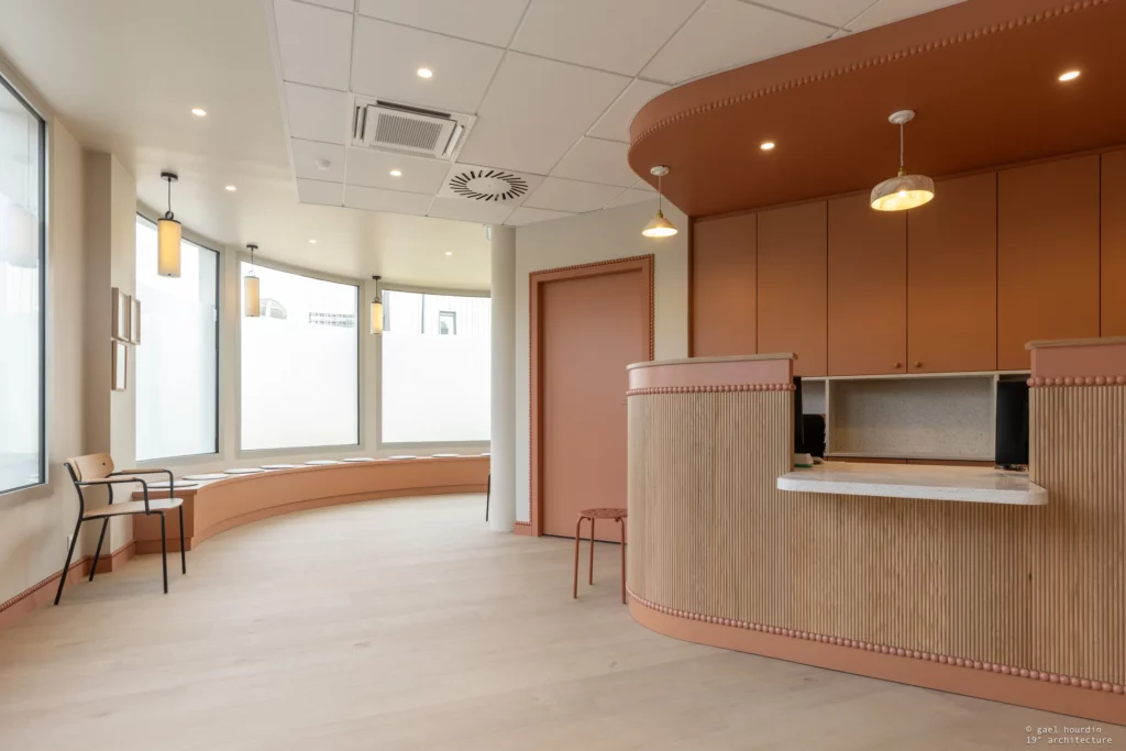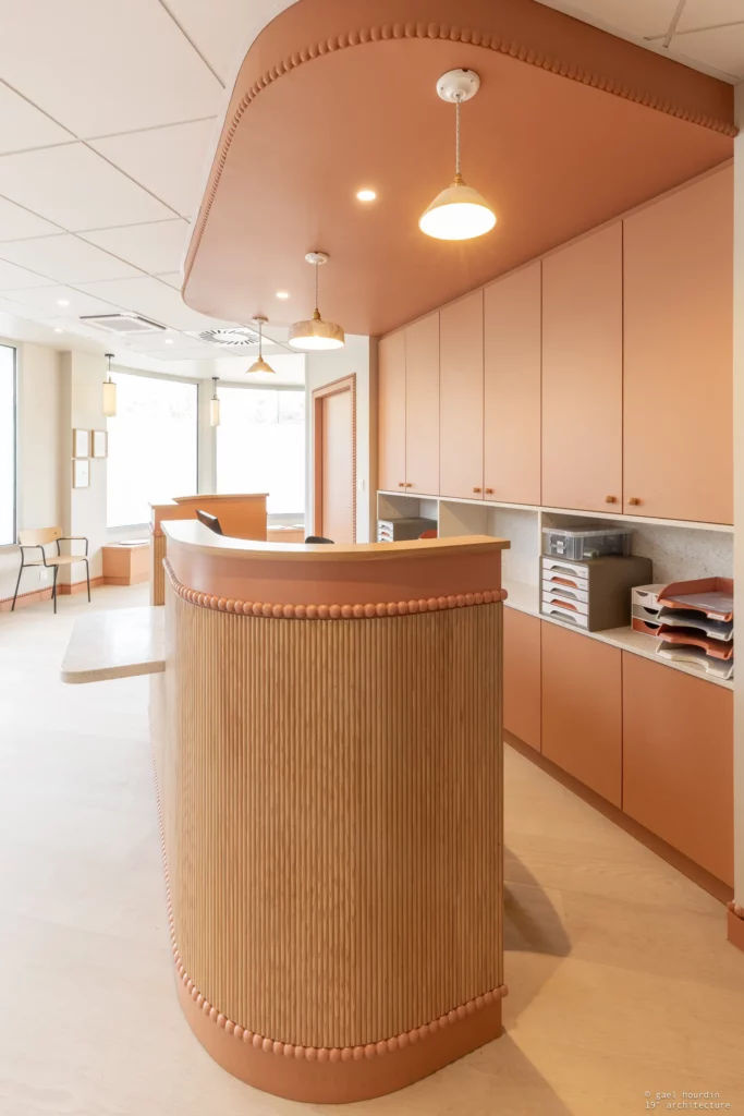 Ce projet tire son essence de l’architecture même du bâtiment : nous avons sublimé la courbure existante de la salle d’attente pour en faire notre fil conducteur. La rondeur adoucit chaque espace, du majestueux comptoir d’accueil en tasseaux de bois et terrazzo, jusqu’aux délicates moulures perlées qui ont inspiré la signalétique sur mesure. Une palette douce dicte l’ambiance, mêlant le blanc pur aux teintes ocre et terracotta dans les espaces d’attente.