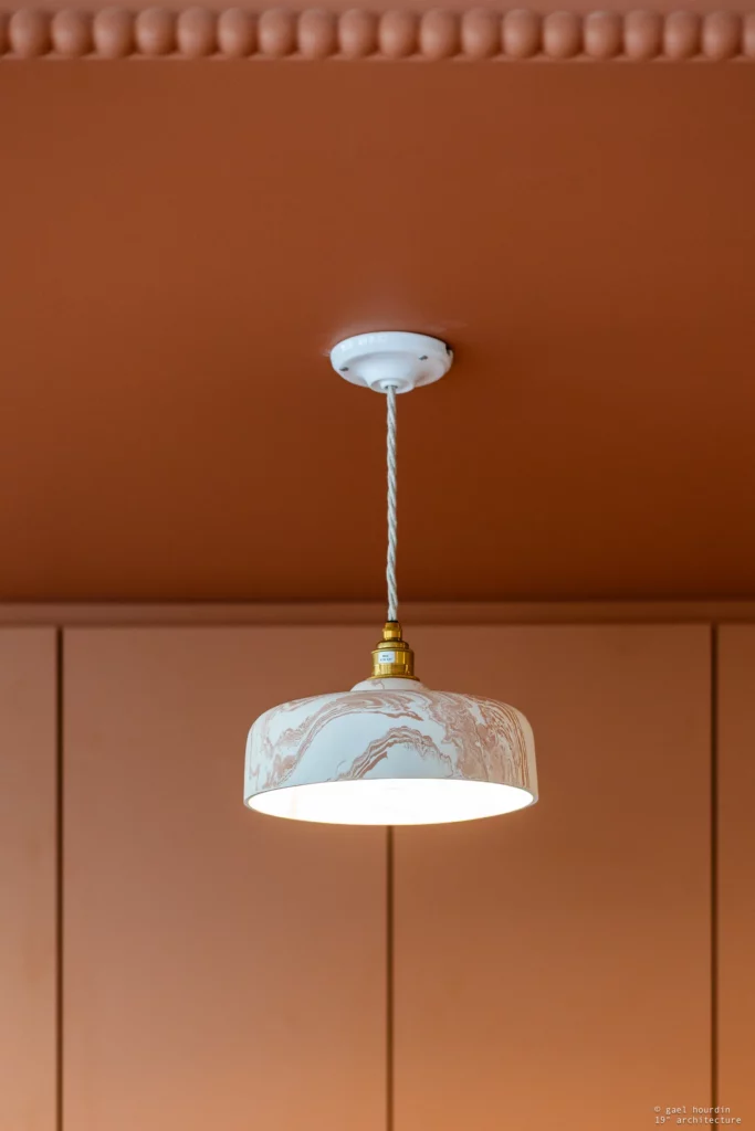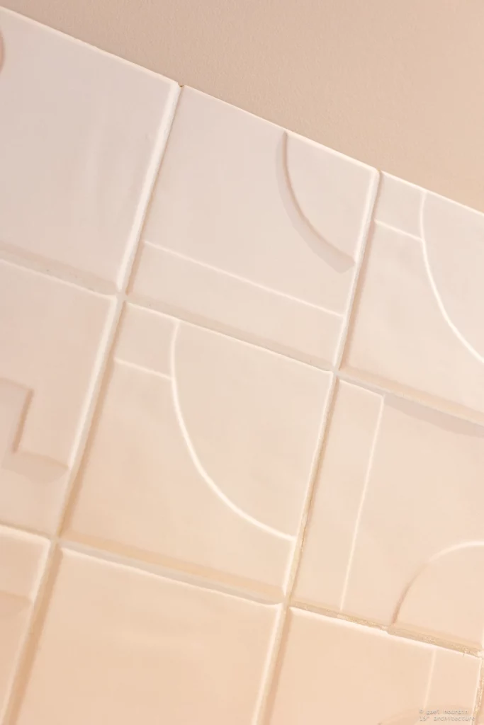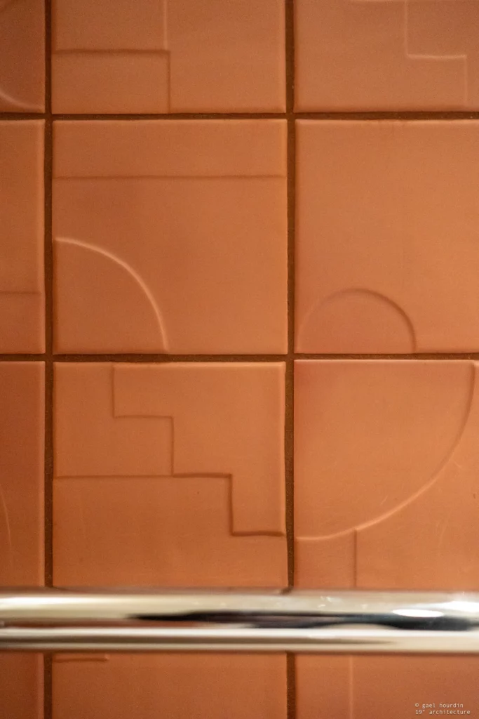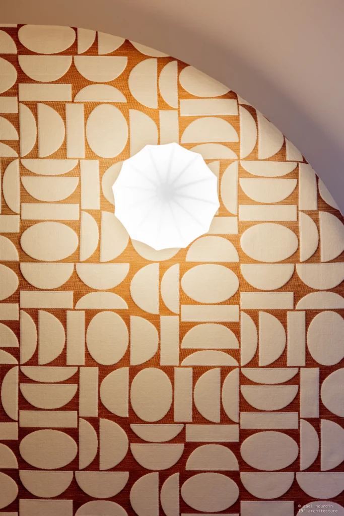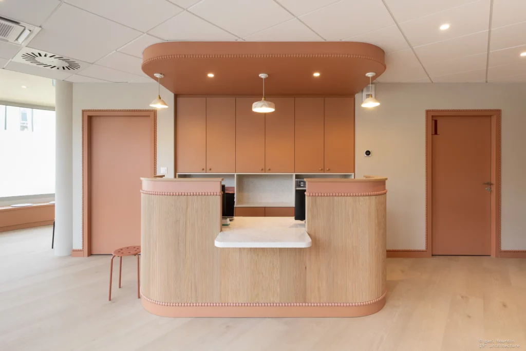 Ce projet tire son essence de l’architecture même du bâtiment : nous avons sublimé la courbure existante de la salle d’attente pour en faire notre fil conducteur. La rondeur adoucit chaque espace, du majestueux comptoir d’accueil en tasseaux de bois et terrazzo, jusqu’aux délicates moulures perlées qui ont inspiré la signalétique sur mesure. Une palette douce dicte l’ambiance, mêlant le blanc pur aux teintes ocre et terracotta dans les espaces d’attente.
