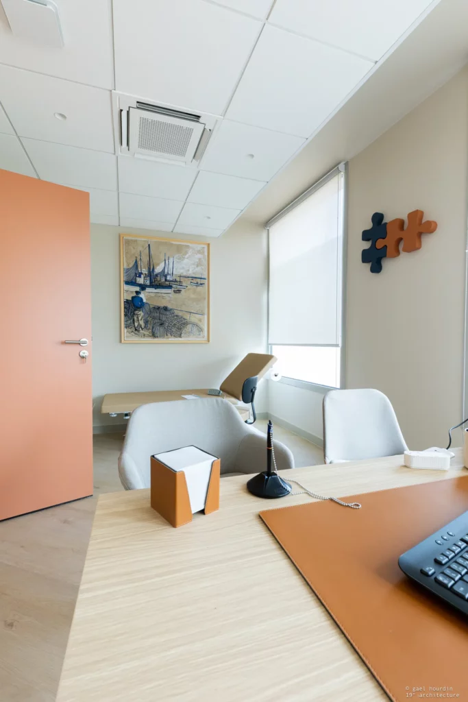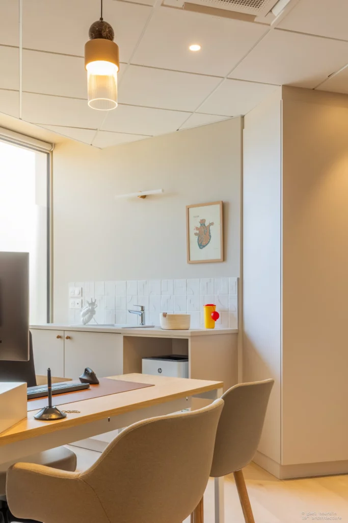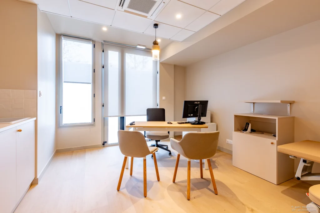L’objectif de ce nouvel aménagement signé 19 Degrés Architecture était de concevoir un espace où l’on se sent bien dès l’arrivée. Loin des codes cliniques froids, nous avons imaginé un lieu baigné de lumière, chaleureux et feutré.