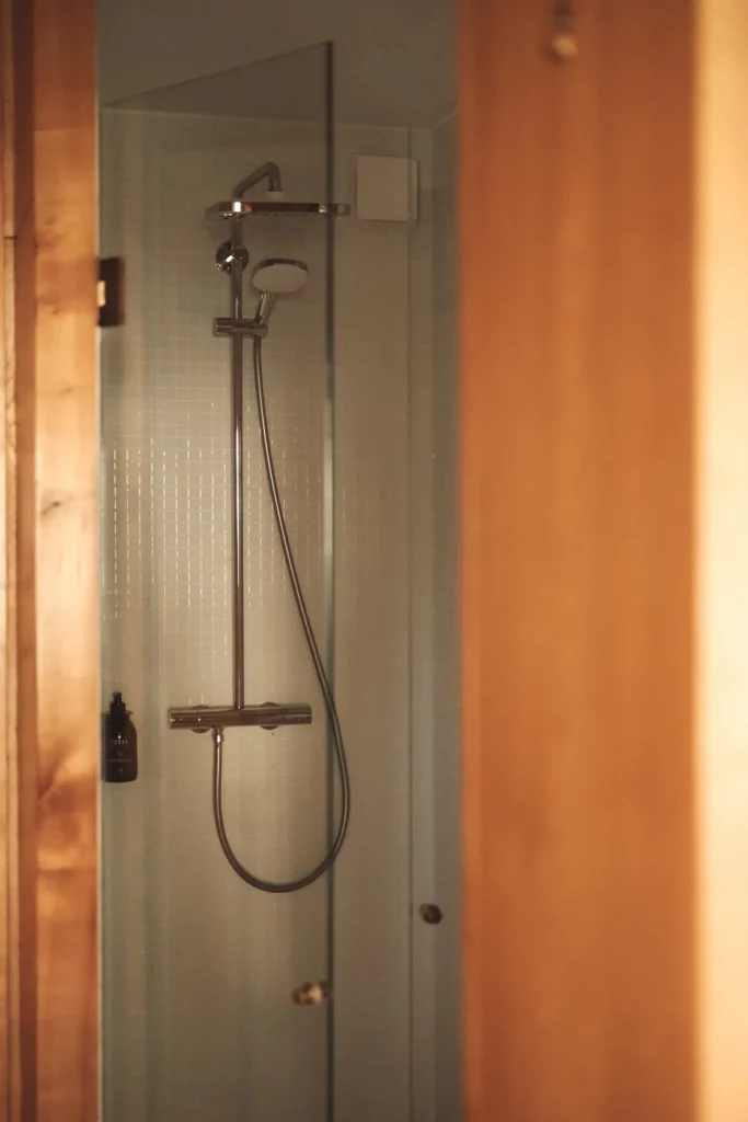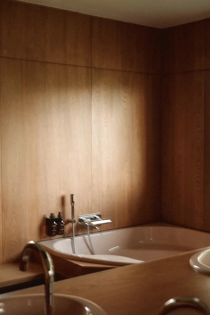 La salle à manger, ouverte sur la cuisine, favorise convivialité et fluidité. La salle de bain, entièrement habillée de bois avec des touches de mosaïque bleu clair, évoque une cabine de bateau.